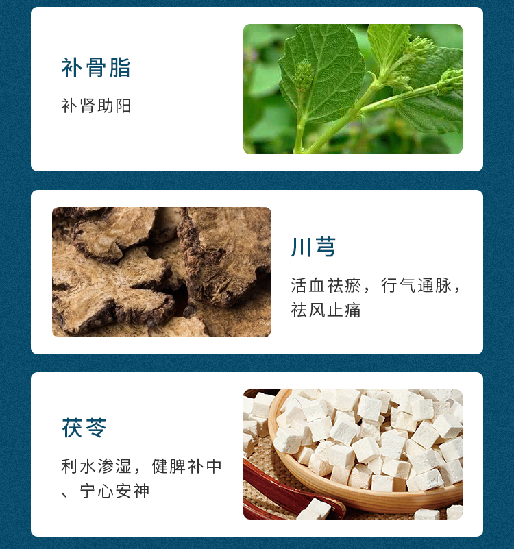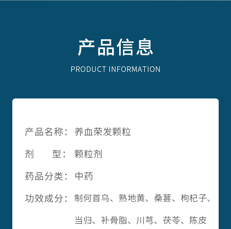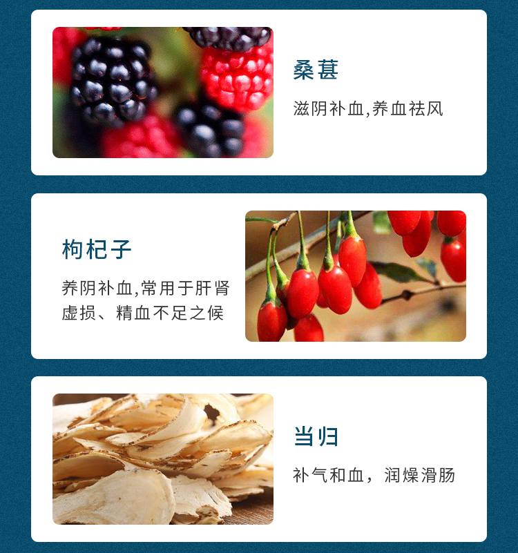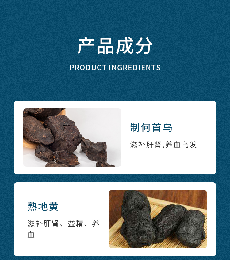 制何首乌、熟地黄、桑葚、枸杞子、当归、补骨脂、川芎、茯苓、陈皮。